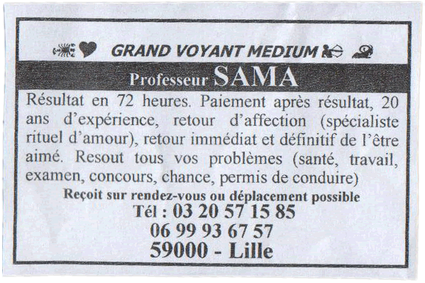 "Si la malchance vous poursuit," (comme un chien derrière son maître ?), "si l'amour vous oublie, si vous subissez la vie au lieu de la vivre, venez me voir pour résoudre tous vos problèmes." C'est trop beau, comme il parle. |
