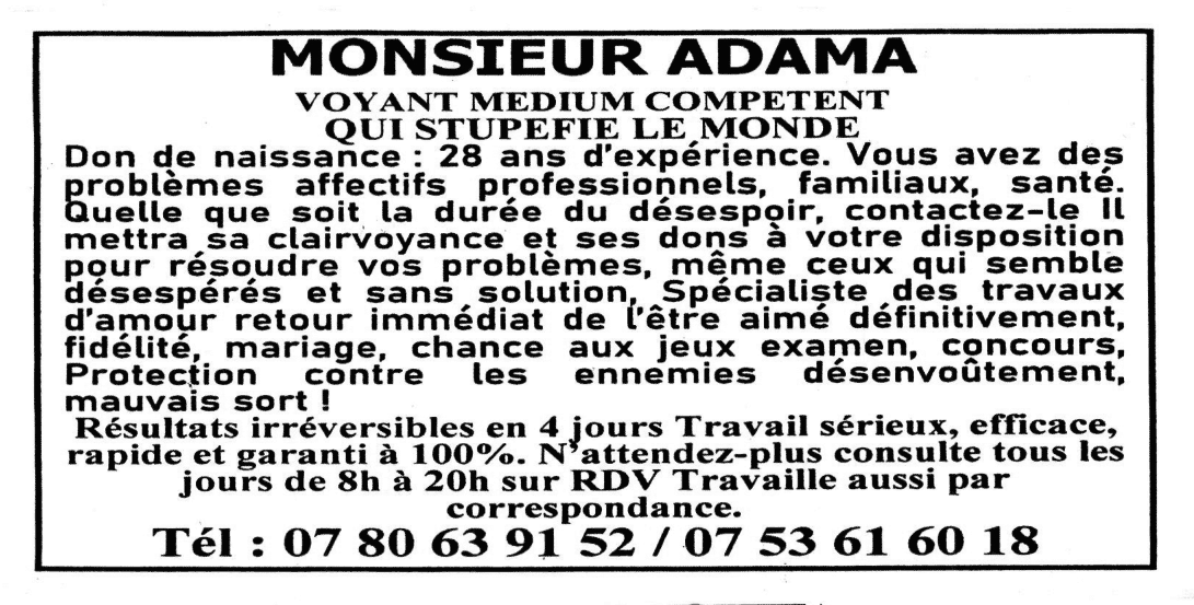 "Excellent MARABOUT Guérisseur, Voyant et Moraliste" Contrairement à ce qu'on pourrait penser, le terme de "marabout" ne figure que très rarement sur les flyers. Quant à "Moraliste", c'est encore plus rare, et totalement savoureux.